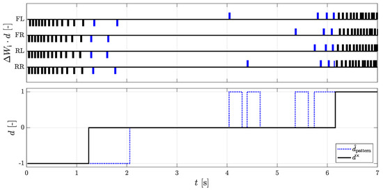 For an early recognition of a change of the rolling direction, a procedure that investigates the chronological sequence of the DWPC of the individual wheels in pairs was developed. A detailed description of the procedure with an example can be found in the patent application [9]. The principle is similar to the direction recognition of the AMR+ sensors, where two encoder rings are used to detect a phase shift of the signals. In Figure 3, one recognizes that the DWPC for the time range –2 s alternate with the following scheme [..., RL, FR, RR, FL]. The schema [FL, RR, FR, RL, ...] is then reflected, and the vehicle has changed its rolling direction. The first four DWPCs of the front left and the rear right wheel and the three DWPCs of the front right and rear left wheel have thereby no directional affiliation by the signal of the AMR+ sensors. It can also be seen that the direction of the driving is maintained for 250 ms in order to prevent fast direction changes.