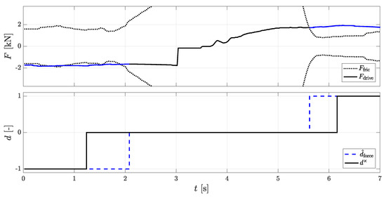 In Figure 4 the driving force and the positive or negative value of frictional force from the force equilibrium are represented. As soon as the driving force exceeds the friction force a rolling direction is defined and the line in the top figure changes from blue to black. As soon as the driving force is smaller in amount than the frictional force and there is no DWPC for 200 ms a save standstill is defined.