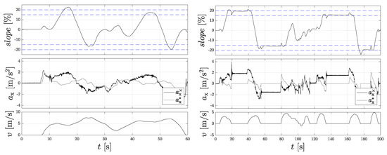 To validate the slope calculation, test drives were performed on a test hill with a defined gradients of 15% and 20%. In front of and behind the hill, the ground is flat. It is assumed that the zero-point error has already been corrected by a sensor calibration at the start of the vehicle in the flat plain. Figure 5 (left) shows the results for the first measurement on the hill. Here, the gradient hill was crossed faster and not stopped within the gradient. The dashed lines indicate the areas with 15% and 20% gradients, respectively.