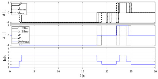 Figure 6 shows the procedure of the Dual-Localization filter and the change of the initialization states. The figure above shows the rolling direction signals of the Dual-Localization filter for a complete parking process consisting of a parking in and parking out process. The middle figure shows the directional estimation. The figure below shows the time course of the initialization state signal from Table 1.