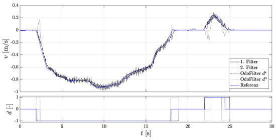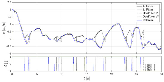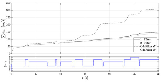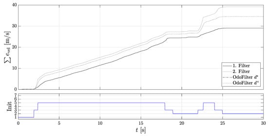 It can be seen that the 2nd localization filter is initialized after each start-up because the estimated direction was correct. Here, one sees the performance of the methods presented in Section 3 for faster detection of rolling direction. In addition, the accumulated velocity error is considered for the evaluation, since the assessment criteria of comparison of the position gives an incorrect impression, as they do not explicitly consider the rolling direction. An incorrectly assumed rolling direction signal can compensate for the position error. Figure 8 shows the accumulated velocity error. Here, the 1st localization filter and the comparison filter with the estimated direction achieve the same very good performance.