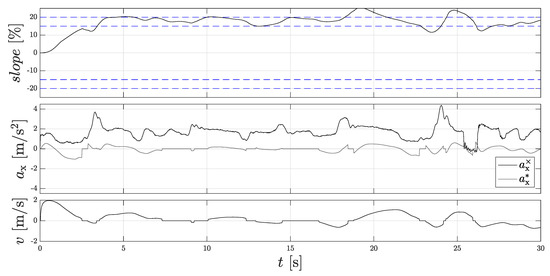 At the beginning of the measurement, the vehicle stands still. Due to the reference measurement system, a negative zero offset of −1.3 can be detected, since an acceleration is measured at standstill, which one can read at 0 s. In the first 3 s, the vehicle drives up the 20% gradient hill at about 2 m/s, which can be seen from the increasing angle of inclination and the increasing vehicle speed. From 5 s upwards, the maximum gradient angle of 20% is reached (see reference curve). The vehicle is then braked to a standstill. As the process continues, the vehicle is continuously started and braked. In addition, the vehicle can also roll back easily from time to time, which can be deduced from the negative velocities. The maximum value here is 28%, and the minimum value is 12%. Since the estimated slope changes with permanent starting and braking, this also has an influence on the estimated direction. The estimated direction is determined by the sign of the resulting force equilibrium. As a result, the constantly changing force direction can lead to an error in the estimated direction. The Dual-Localization filter structure counteracts this, since the evaluation logic detects the wrong estimated direction as soon as an AMR+ rolling direction is present again.