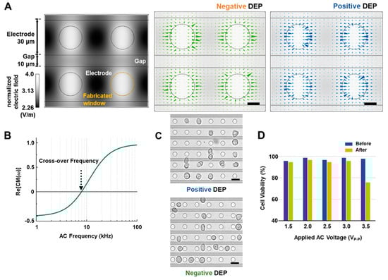 The simulation results of our interdigitated electrode with circular windows, where radius of the window, gap between electrodes, and width of the electrode are 10 µm, 10 µm, and 30 µm, respectively, are shown in Figure 1A,B. According to Figure 1B, the cross-over frequency is about 7.9 kHz when the following parameters are applied: the permittivities and conductivities of MCF-7 and the buffer solution are 50 ε0(εcyto), 80 ε0(εmemb), 78.5 ε0(εmedi), 0.01 S/cm, and 60 μS/cm, respectively (Table S1) []. Below the cross-over frequency, negative DEP force pushes the cell to in-between the windows, where the electric field gradient is minimized. Above the cross-over frequency, the cell moves into the window where the electric field gradient is maximized under positive DEP force, resulting in the alignment of MCF-7 cells shown in Figure 1C. Figure 1D shows cell viability percentages before and after applying AC signals under the same conditions that we would use for the observation of cellular behavior in the fabricated dielectrophoresis microfluidic (DEP-μF) chip. According to these results, the viability of MCF-7 cells is above 95% before and after applying the experimental conditions when the applied voltage is below 3.0 Vp-p. Hence, any voltage below 3.0 Vp-p might be selected for the experiment. However, we selected the voltage by the following criteria: the voltage should be as small as possible, and the voltage should be sufficient to move the cell. Under these criteria, 2.0 Vp-p was selected for further investigation.