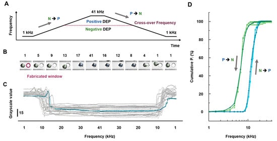 (A) Schematic illustration of the input AC frequency waveform in response to different modulation directions (i.e., 1 → 41 → 1 kHz in 2Vp-p), where the frequency modulation rate was 0.4 kHz/s (B) In situ monitoring of cellular DEP behaviors, showing an individual cell trapped in the positive and negative trap regions during increasing and decreasing frequency modulations. (C) Variation of grayscale levels in the circular window region as AC frequency changed (1 → 41 → 1 kHz). The blue line is the grayscale value in response to the cellular behavior shown in the sequential images in Figure 2B. The AC input frequency was fixed for 100 s each at 1 and 41 kHz to stabilize the trapped cell motion. (D) Hysteresis curve of the cumulative percentage as a function of the frequency for cells stopping just inside the window regions after entering and the trapped cells inside the windows started to move during the frequency modulation period shown in Figure 2A.