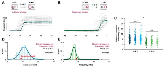 (A,B) Variation in grayscale levels in the circular trap region of the cell affected by negative and positive DEP forces in accordance with changes in frequency (1 → 41→ 1 kHz). (C) Effective cross-over frequencies of the biological cells under increasing and decreasing frequency modulations when the experiment was repeated in triplicate (* p < 0.001 and “n.s” represent “non-significant” (p > 0.5)). (D,E) Histogram and Gaussian fit of the effective cross-over frequencies measured during increasing and decreasing frequency modulations, respectively. The simulation point is the cross-over frequency, shown in Figure 1B.