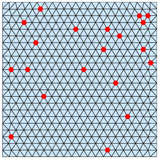 Consider a scalar field governed by a Poisson equation on a square domain . A mesh is generated on using Distmesh [18], which has 494 nodes and 899 triangles. That is, , , . Deploy 20 sensors randomly in , and the location set is . All sensors form a network by means of a fully-connected communication topology. The mesh and sensor nodes are shown in Figure 1.