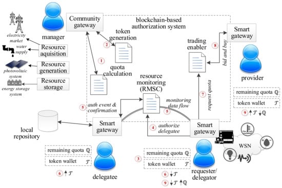 The structure of the paper is as follows: Section 2 presents the state of the art on resource monitoring in smart homes and blockchain technology for resource coordination and trading. Section 3 describes the functional components required for the formalization of the solutions and the supporting architecture for smart communities. The main contributions of our work, that is, the abstract model for the authorization system and the trustworthy resource sharing are described in Section 4 and Section 5 respectively. The system implementation and some experiments and results are provided in Section 6 and Section 7. Finally, Section 8 shows the conclusions and future work.