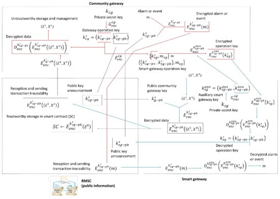 Through an auxiliary communication channel (not through the blockchain network) the Smart gateways communicates the corresponding public key to the Community gateway. Blockchain is a technology to make agreements about certain information among a community of users. In this proposal, public operation keys are published and transmitted through blockchain networks to turn them into trustworthy information. However, when only two entities must perform a private negotiation process (such as in the exchange of auxiliary keys), blockchain networks are useless (there is not a community of users to support the system) and, besides, private information is publicly communicated and stored. Thus, blockchain networks must only manage public information to be shared among all members in the community. Definitely, as, in this case, an agreement and trust among all the gateways in the private network is not required, keys do not have to be exchanged by means of the blockchain. In parallel, the Community gateway employs a new key generator that presents the vector structure of Equation (4). It receives as parameters the private operation key and a n-tuple of additional parameters to increase the generator entropy. As result, the generator produces the Smart gateway operation key and a piece of information , which is unique for Smart gateway and is called “homomorphic constant.”