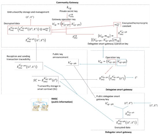 In this expression, is a specific homeomorphic constant for the selected encryption scheme and the employed Community gateway and Smart gateway operation keys. This constant must be calculated each time a delegatee Smart gateway operation key is generated.