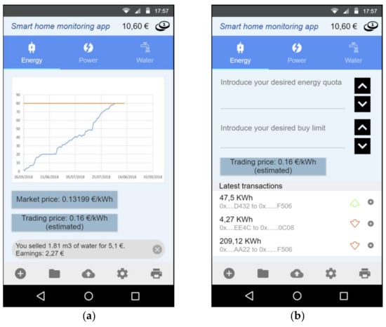 It is worth noting in the conclusions of this paper, that apart from the advantages clearly introduced by blockchain technology in terms of reliability of data, transparency in the distribution and exchange of resources, ease of establishment of transactions between untrusted peers and security in establishing authorization mechanisms, it also introduces a number of disadvantages. Firstly, high latency; it is observed that 20% of the transactions are reflected in the nodes after more than 20 s (generation time of two blocks). In addition, computational and storage overheads, resulting in a data generation rate of up to 3 GB per year, which must be stored in devices that could be of limited resources. Finally, there is the possibility, although remote, that a 51% attack will succeed and control the network, although the odds of this are at the level of other consensus-based security solutions. As future work, we will address the problem of sources of renewable energy generation within a smart community and how to adapt our model of resource monitoring and trading to contemplate prosumer users and the supply of surplus energy back to the grid. We would also like to advance in the generalization of the incentive management model to contemplate other aspects beyond energy saving, as a general collaborative model in a community of users. As smart contracts naturally lend themselves to machine-to-machine direct negotiations and transfer of goods, without human intervention, we will also improve the proposed mobile application to allow the user to establish their purchase preferences based on rules. These rules would be evaluated by the user’s smart home and would directly produce the automatic purchase or sale of resources if the given conditions are met.