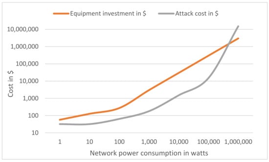 As can be seen in this figure, results indicate that in general, the investment in equipment in order to expand the mining capacity of the network is a bad approach, as 51% attack always requires less investment. Note that the attack does not include the block rewards that the miner will receive for mining. Thus, the difference would be higher.