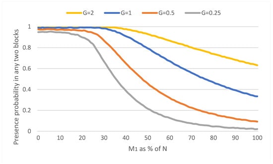 We perform an execution of our system using 40 Docker virtual nodes based on Ubuntu 18.04.1. We measure the average value of the probability that a given transaction is present in the creation of the next two blocks, varying G and . We use the following two blocks and not only the next one because this way we avoid race conditions in the infrastructure, for transactions that occur in a timestamp very similar to the discovery of a new block. The results are shown in Figure 10.