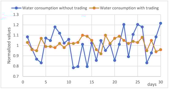 We consider a community formed by 40 homes whose water consumption behaves in this random way. We compare this simulated consumption with the situation of having the resource trading algorithm operative. We simulate the user’s behaviour using the resource trading system so that when they want to consume more than the daily limit, they request that consumption from the home with the lowest consumption level.