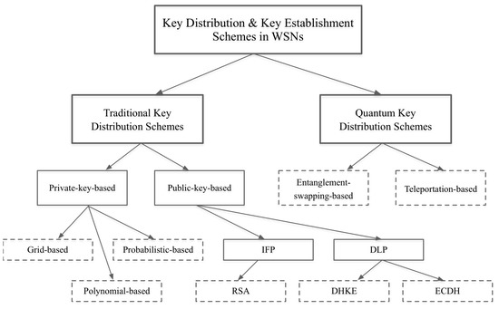 - We introduce a comprehensive classification for the main key distribution and key establishment schemes in WSNs. We classify the schemes into traditional key distribution schemes, including private-key-based schemes and public-key-based schemes, and quantum-based key distribution schemes, including those based on entanglement swapping and teleportation.