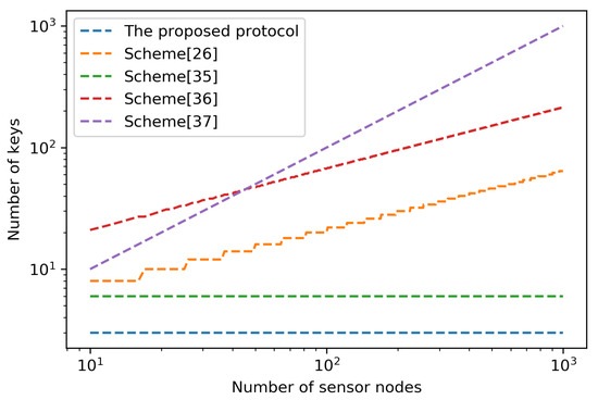 Table 4 illustrates the key storage overhead of the proposed protocol and the corresponding schemes. In the pre-deployment phase of the proposed protocol, each sensor node stores two keys, and . Then, in the key distribution phase, each sensor node prepares its unique key, . Therefore, the proposed protocol has the lowest key storage overhead for each sensor node compared to the corresponding schemes. The logarithmic graph presented in Figure 2 shows the magnitude of the key storage overhead as the number of sensor nodes increases. The graph clearly shows that the proposed protocol is advantageous because it requires the fewest keys compared to other schemes.