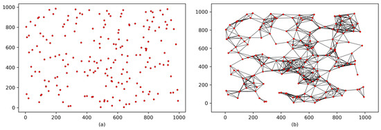 To evaluate the key connectivity in each scheme, we model the entire WSN with a graph in which the vertices represent wireless sensor nodes and the edges represent links. Therefore, Figure 3a shows a random deployment of 200 nodes over an area of 1000 ft · 1000 ft. In Figure 3b, the black links indicate the wireless signal range of the nodes’ transceivers without applying either the proposed protocol or the corresponding schemes. The wireless signal range is based on the nodes’ transceiver modules (described in Appendix A.1).
