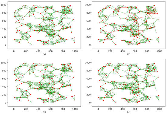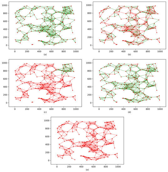 Figure 4 shows the implementation of the proposed protocol and the corresponding schemes on the WSN shown in Figure 3b. However, when two sensor nodes share a common key or key material within the same wireless range, the black links are converted to green links. In contrast, the red links indicate nodes that do not share a common key or any key materials. This modeling shows the key connectivity of each scheme, which can be defined as follows: