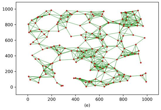 where the term “” includes any link between two nodes that share a common key or key materials, and “” counts all links in the WSN. Figure 4a,c,e show that the key connectivity is certain because nodes in these schemes are designed to have either a shared common key or key materials that lead to 100% key connectivity. In contrast, the key connectivities in Figure 4b,d reach only 87% and 99%, respectively.