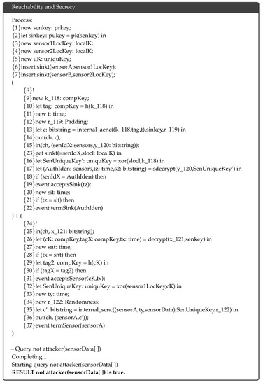 ProVerif provides proof of reachability and secrecy properties by investigating the reachability of a term x by an adversary . Based on the results, the secrecy of x can be assessed with respect to the modeled protocol. In the proposed protocol, we test whether sensor data “sensorData” are available to . Figure 6 shows the complete verification result. The result concludes, “RESULT not attacker(sensorData[ ]) is true”, meaning that “sensorData” is unreachable, and an attack cannot be conducted against the protocol successfully.