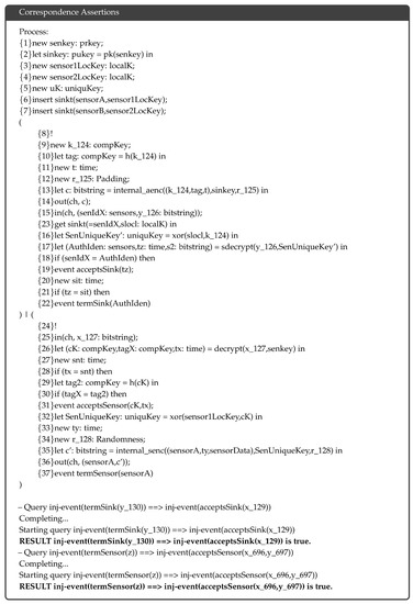 In ProVerif, authentication can be modeled using a sequence of events defined as correspondence assertions. We apply a sequence of events to verify the authentication of the sink node and the complementary key to the sensor nodes and the authentication of the sensor nodes and encrypted data to the sink node. Figure 7 shows the complete verification result. The verification confirmes that the proposed protocol achieves successful authentication.