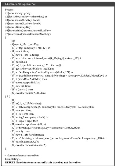 In applied -calculus terminology, two processes and have observational equivalence when they are indistinguishable through observation. ProVerif can prove observational equivalence such as strong secrecy, in which an adversary 𝒜 cannot distinguish when a cipher changes. We leverage this feature to prove that the proposed protocol is semantically secure and that the 𝒜 cannot learn anything from the cipher. Figure 8 shows the complete verification result. The analysis showes that the sensor data “sensorData” in the proposed protocol are observationally equivalent and that the 𝒜 cannot distinguish when they change because the data are encrypted by a probabilistic algorithm, as described in the post-key distribution phase.