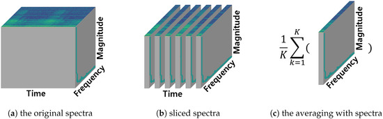 The process for obtaining the average spectrum of spectra. (a) original spectra obtained from Short-Time Fourier Transform (STFT) or Mel-Frequency Cepstral Coefficients (MFCC) feature extraction; (b) sliced by time axis spectra according to the number of window used in STFT or MFCC feature extraction; (c) average of sliced spectra.