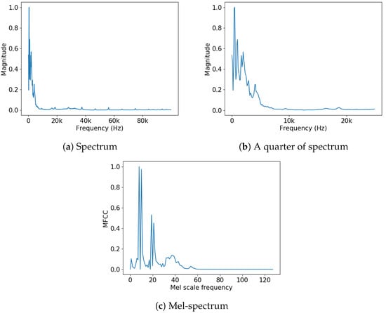 Subfigures (a,b) are time-averaged spectrum after STFT and (c) is 128-dimensional time-averaged Mel-spectrum after MFCC feature extraction. (a) represents a range of 96 kHz, with a resolution of 1025; (b) is an expanded view of a quarter of (a). Each unit of (c) represents one MFCC filter bank.