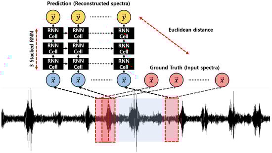 Structure of Fast Adaptive Recurrent Neural Network (RNN) Encoder–Decoder (FARED). The input is constructed by sequential spectrum (red box). Each spectrum has of overlapping in the time domain. The output is a sequential reconstructed spectrum from input sequences. The Euclidean distance between prediction and ground truth is used for training and anomaly detection.