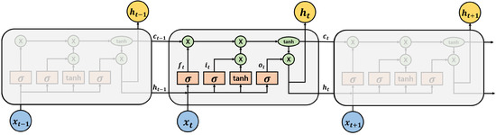The structure of the Long-Short Term Memory (LSTM) cell. It contains input gate , output gate, , forget gate , hidden state and cell state . The symbol means sigmoid function and tanh means hyperbolic tangent function.
