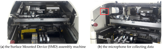 The dataset (CREVIS Co., Ltd.,Yongin, Korea) consisted of sound data acquired from SMD assembly machine with 192 kHz of sampling rate. The data collection process is shown in Figure 5. Sequential machine operational sound data were collected from an operating SMD assembly machine placing a microphone as indicated by the red bounding box in Figure 5b.