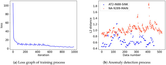 Results of the training and detection process. When GTX 1060 3 GB for 1 k iteration with minibatch size 100 was used, it took about three minutes when using MFCC. The ’NA-9289-MAIN’ is regarded as abnormal while ‘AT2-IN88-SINK’ is regarded as normal. FARED can distinguish between ‘AT2-IN88-SINK’ and ‘NA-9289-MAIN’ as shown in subplot (b).