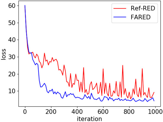 Comparison of Ref-RED and FARED training process. It shows that loss of the FARED converges faster and more stable than Ref-RED under same conditions (1 k iterations with minibatch size 100 of training and 0.005 of learning rate).
