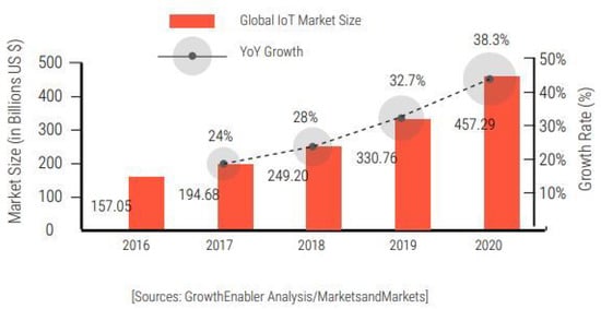 Nowadays, the term “ubiquitous computing” is widely known, which refers to a computing environment that a user can access through any device with no restrictions in terms of time and place []. For a long time, the research on ubiquitous computing has progressed steadily. In 1966, the first ubiquitous computing study investigated wearable computing and attempted to combine clothing with computers []. Ubiquitous computing is a broader term; thus, it can be classified into various sub-topics. One of them is called the Internet of Things (IoT), which has gained considerable attention in recent years. The IoT refers to a network environment, in which a large number of objects, sensors or devices are connected through the Internet or some other communication infrastructure to provide value-added services []. This term was first coined in 1998, and the basic idea behind this technology is to connect people and objects anywhere and anytime []. In the near future, we will live in a society where all objects surrounding us will be smart objects interconnected via the IoT, communicating with each other with minimal human intervention. Thus, the ultimate objective of the IoT is a better world, where every device is aware of our desires and needs and acts on behalf of human beings without requiring explicit instructions []. Consequently, the market for IoT devices has been continuously expanding. As shown in Figure 1, GrowthEnabler forecasts that the global IoT market scale will reach $457.2 billion by 2020 [].