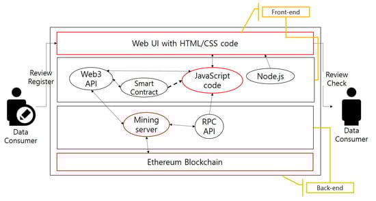 The review system for the IoT data has four components: a web browser, which is the user interface (UI), the JavaScript code containing the smart contract bytecode, a mining server receiving the generated transactions within a block and an entire blockchain database (as shown in Figure 2). Figure 3 shows the review registration process, in which these components operate.