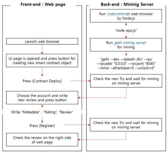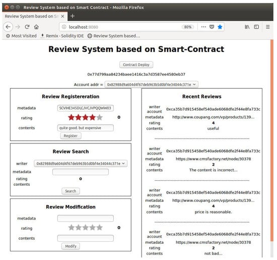 A web page is a front-end element interacting directly with the user. In this study, a web page was developed using the HTML and CSS code and was connected to a web browser, which is an HTTP interface, using Node.js. When the user adds a review, checks a registered review or modifies a written review, a function of the corresponding JavaScript code is called. As shown in Figure 3, the review writer launches the web browser, and then, the linked UI page is opened. On the web page, the “Contract Deploy” button is clicked to create a new smart contract, and the user selects one of their accounts to be used as the writer’s identity of the review. A unique value is entered for the shared data (metadata); a rating is given; and a brief review is submitted. To check the review, a user can select the account that he/she created and enter the metadata value to confirm the submitted rating and review. A review can be modified in a manner similar to registration, in which the user enters the metadata, modified rating and modified content. Recently added or edited reviews are shown at the right side of the main web page. The detailed implementation result is described in Section 4.2.
