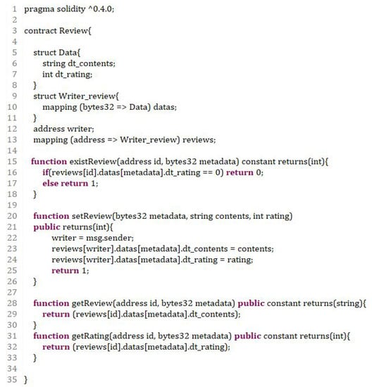 The smart contract used in this review model consists of four functions and two structures, as shown in Figure 4. Each of the four functions performs operations to check for the existence of a review, register a review, check the content of a review or check the ratings associated with a review. In the two structures, the “Data” structure for storing the reviews consists of “dt_contents,” which is a string value, and “dt_rating,” which is the rating associated with a review. The “Writer_review” structure contains “datas,” an array of “Data” structures, indexed by the metadata values with the “mapping” keyword. Additionally, a user can look at the reviews, stored in the “Writer_review” structure array, created by each address using the address value of the transaction creator as an index.