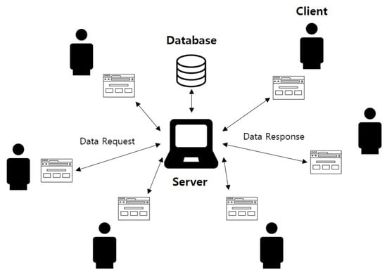 The existing review systems are mainly used by online retail and service providing platforms. The overall structure of the existing system is a centralized server-client model, in which a central server responds to numerous client programs requesting service, as shown in Figure 5. The server-client model has both an application and a network structure. This model separates the work between the client, which is the service requester, and the server, which provides the service. Generally, a server-client system refers to a system in which a computer runs an application that functions as a client making a service request, which is processed by the server. The server-client model is used in most web interfaces; thus, it is applied to systems with various purposes, such as customer support systems [] and product data management systems [], in addition to review systems. In [], a customer support system using traditional methods, such as phone call surveys, is described as a method used by companies to receive customer feedback for improving the quality of their product or service. However, a web-based system has many advantages, such as an effective interaction between a customer and a system, and system accessibility; thus, the authors of [] proposed a web-based customer support system. In [], the advantages and disadvantages of the web-based server-client model were investigated in terms of their application to a product data management system. The advantage of a product data management system with a web interface is that this system is easy to use, access and connect to several subsystems. Conversely, the disadvantages of the client-server model consist of security vulnerabilities and bandwidth issues that occur when transferring large files, such as CAD files.