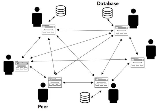 To overcome the disadvantages of the server-client model, the decentralized model has emerged, in which all nodes participate equally in the network, as shown in Figure 6. Moreover, the review system developed in this study uses a blockchain database based on the P2P network, which endows this model with the advantage of larger bandwidth, because all nodes in the network must communicate with each other. In most cases, the P2P network resources are typically distributed across multiple nodes in the network. The blockchain system also maintains a distributed database based on these characteristics. Even if some nodes are facing data sharing problems, other nodes can still receive data from the remaining nodes on the network. The blockchain-based model has the advantage of low maintenance cost. For a server to respond to all client requests, specific software and hardware are required to perform the request, which increases the cost of operation. However, in the blockchain-based model, which is a distributed P2P network environment, a single node is not expected to handle all tasks. Therefore, this model can be maintained at a relatively low cost.