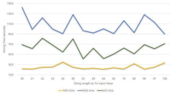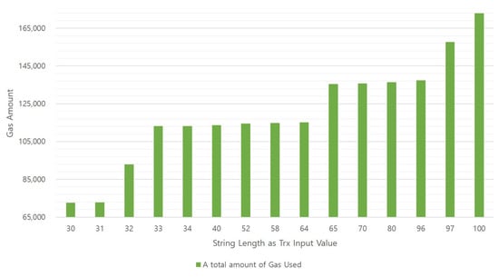 Figure 8 shows a graph of the relationship between the string input length value and the amount of gas used. The horizontal axis of the graph represents the input length value, which is an independent variable, and the green bar graph on the vertical axis represents the amount of gas consumed. The gas consumption per transaction is extracted using “web3.eth.getTransactionReceipt(TrxHash).gasUsed” of the Web3 API []. Figure 9 is a graph that illustrates the relationship between the string input length and transaction mining time. As shown in Figure 8, the result of the mining time value of the vertical axis according to the independent variable value of the horizontal axis can be confirmed in Figure 9. The time value is in JavaScript using “console.time()” and “console.timeEnd()” [].
