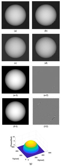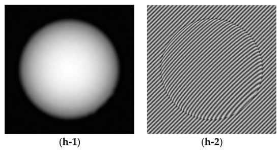 Simulated projection fringe patterns of sphere shape. (a) Fringe pattern with frequency 1/8 without noise added; (b) Fringe pattern with frequency 1/16 without noise added; (c) Fringe pattern with frequency 1/8 with Gaussian noise added; (d) Fringe pattern with frequency 1/16 with Gaussian noise added; (e-1) The ground truth background part of Figure 1a,c; (e-2) The ground truth fringe part of Figure 1a,c; (f-1) The ground truth background part of Figure 1b,d; (f-2) The ground truth fringe part of Figure 1b,d; (g) The ground truth phase.