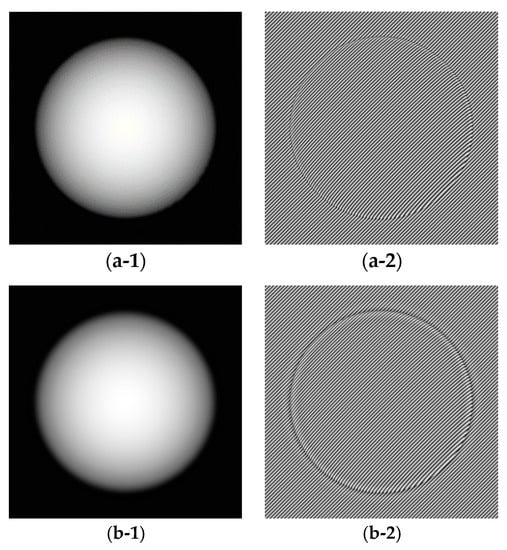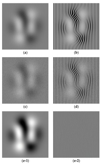 Similarly, Figure 2a,b are simulated fringe pattern with smooth changes with the sizes of 512 × 512 pixels. They are generated by: