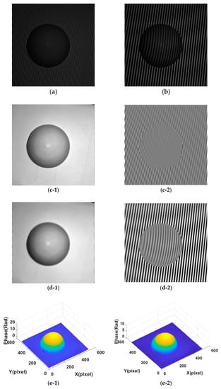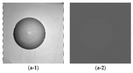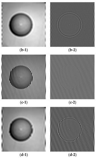 Figure 3 shows experimental fringe projection patterns with image sizes of 512 × 512 pixels, which depicts a model of plastic sphere. Figure 3a is with a large frequency while Figure 3b is with a small frequency. Figure 3(c-1) shows the ground truth background part of Figure 3a; Figure 3(c-2) shows the ground truth fringe part of Figure 3a; Figure 3(d-1) shows the ground truth background part of Figure 3b; Figure 3(d-2) shows the ground truth fringe part of Figure 3b; Figure 3(e-1) shows the ground truth phase for Figure 3a; Figure 3(e-2) shows the ground truth phase for Figure 3b. For the experimental fringe projection patterns, we use one projector (DLP LightCrafter 3000, TI, Dallas, TX, USA) with resolution of 608 × 684 to project sinusoidal fringe pattern and gray scale CCD camera (SXG10, Baumer, Frauenfeld, Switzerland) with recording resolution of 1024 × 1024 pixels.