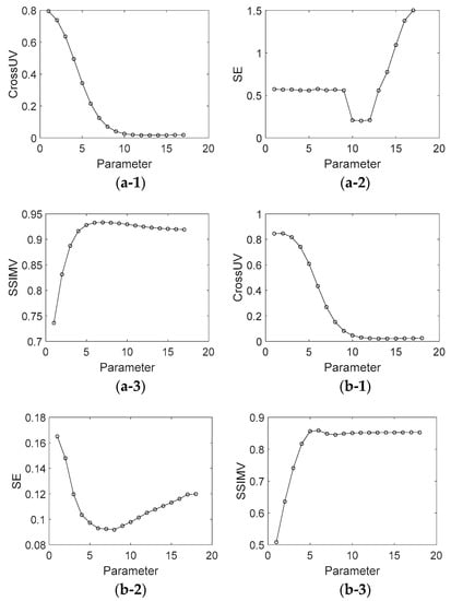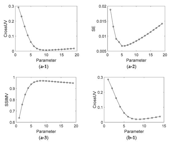 CrossUV, SE and SSIMV for Figure 2 by Fourier transform method with different parameter values. (a-1) CrossUV for Figure 2a; (a-2) SE for Figure 2a; (a-3) SSIMV for Figure 2a; (b-1) CrossUV for Figure 2b; (b-2) SE for Figure 2b; (b-3) SSIMV for Figure 2b. (c-1) CrossUV for Figure 2c; (c-2) SE for Figure 2c; (c-3) SSIMV for Figure 2c; (d-1) CrossUV for Figure 2d; (d-2) SE for Figure 2d; (d-3) SSIMV for Figure 2d.