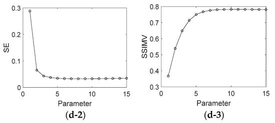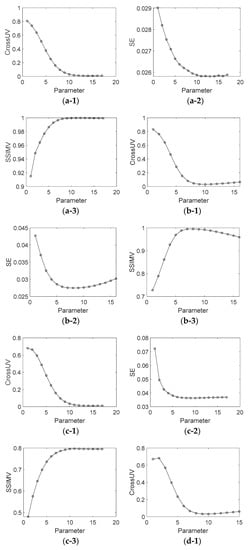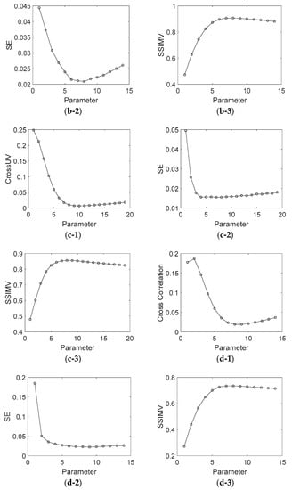 CrossUV, SE and SSIMV for Figure 1 by Fourier transform method with different parameter values. (a-1) CrossUV for Figure 1a; (a-2) SE for Figure 1a; (a-3) SSIMV for Figure 1a; (b-1) CrossUV for Figure 1b; (b-2) SE for Figure 1b; (b-3) SSIMV for Figure 1b. (c-1) CrossUV for Figure 1c; (c-2) SE for Figure 1c; (c-3) SSIMV for Figure 1c; (d-1) CrossUV for Figure 1d; (d-2) SE for Figure 1d; (d-3) SSIMV for Figure 1d.