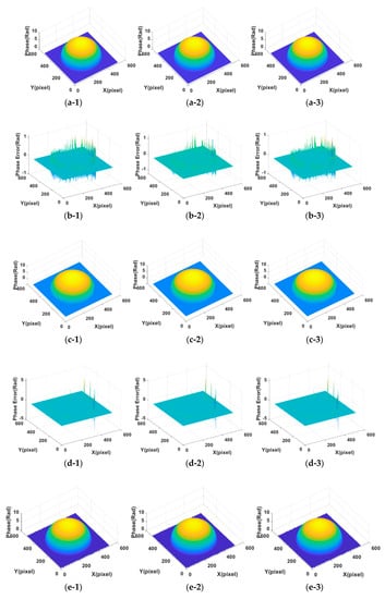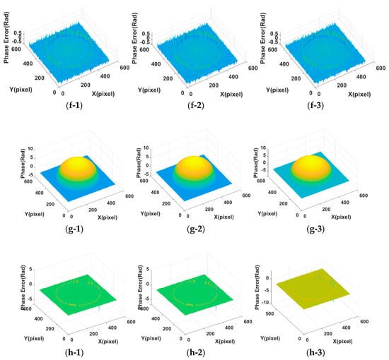 The retrieved phase and phase error for Figure 1 by Fourier transform method under optimal CrossUV, SE and SSIMV. (a-1) Phase under optimal CrossUV for Figure 1a; (a-2) Phase under optimal SE for Figure 1a; (a-3) Phase under optimal SSIMV for Figure 1a; (b-1) Phase error under optimal CrossUV for Figure 1a; (b-2) Phase error under optimal SE for Figure 1a; (b-3) Phase error under optimal SSIMV for Figure 1a; (c-1) Phase under optimal CrossUV for Figure 1b; (c-2) Phase under optimal SE for Figure 1b; (c-3) Phase under optimal SSIMV for Figure 1b; (d-1) Phase error under optimal CrossUV for Figure 1b; (d-2) Phase error under optimal SE for Figure 1b; (d-3) Phase error under optimal SSIMV for Figure 1b; (e-1) Phase under optimal CrossUV for Figure 1c; (e-2) Phase under optimal SE for Figure 1c; (e-3) Phase under optimal SSIMV for Figure 1c; (f-1) Phase error under optimal CrossUV for Figure 1c; (f-2) Phase error under optimal SE for Figure 1c; (f-3) Phase error under optimal SSIMV for Figure 1c; (g-1) Phase under optimal CrossUV for Figure 1d; (g-2) Phase under optimal SE for Figure 1d; (g-3) Phase under optimal SSIMV for Figure 1d; (h-1) Phase error under optimal CrossUV for Figure 1d; (h-2) Phase error under optimal SE for Figure 1d; (h-3) Phase error under optimal SSIMV for Figure 1d.