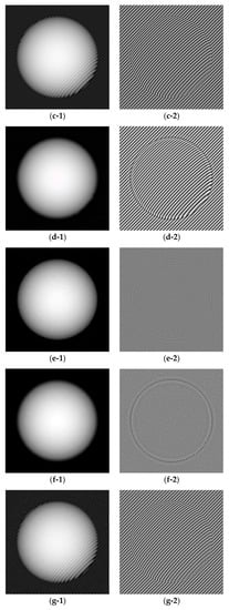 where is the peaks function in Matlab (Mathworks, Natick, MA, USA), , . The carrier frequency for Figure 2a,b are respectively 1/8 and 1/16. Figure 2c,d show the noisy fringe patterns corresponding to Figure 2a,b with Gaussian random noise with variance of 0.2 added [11,12,13]. In addition, Figure 2(e-1) shows the ground truth background part of Figure 2a,c; Figure 2(e-2) shows the ground truth fringe part of Figure 2a,c; Figure 2(f-1) shows the ground truth background part of Figure 2b,d; Figure 2(f-2) shows the ground truth fringe part of Figure 2b,d; Figure 2g shows the ground truth phase.