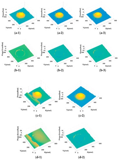 The retrieved phase and phase error for Figure 3b by Fourier transform under optimal CrossUV, SE and SSIMV and Shearlet transform method under different decomposition scales. (a-1) Phase under optimal CrossUV for Figure 3b; (a-2) Phase under optimal SE for Figure 3b; (a-3) Phase under optimal SSIMV for Figure 3b; (b-1) Phase error under optimal CrossUV for Figure 3b; (b-2) Phase error under optimal SE for Figure 3b; (b-3) Phase error under optimal SSIMV for Figure 3b; (c-1) Phase under decomposition layer of 3 by Shearlet transform by Figure 3b; (c-2) Phase under decomposition layer of 4 by Shearlet transform by Figure 3b; (d-1) Phase error under decomposition layer of 3 by Shearlet transform by Figure 3b; (d-2) Phase error under decomposition layer of 4 by Shearlet transform by Figure 3b.