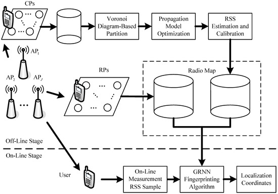 As the basic fingerprinting localization system, our proposed localization system can also be generally divided into two stages: the off-line stage and on-line stage, which is shown in Figure 1. We apply crowdsourcing to the fingerprinting localization system so that the established radio map through interpolation method can be updated continuously according to the RSS variations in the indoor environment.