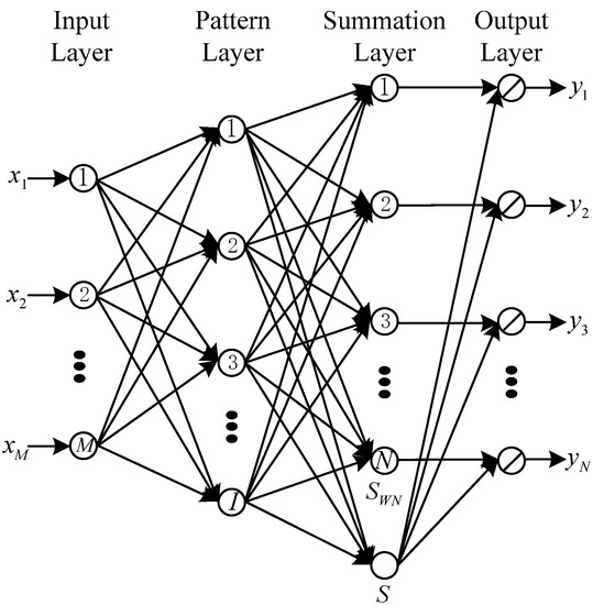 In the summation layer, there are two kinds of neurons. One kind of neuron calculates the weighted sum of the outputs in the pattern layer; the other kind of neuron calculates the sum of the pattern layer outputs. So we can compute the th element of the desired output vector as follows: