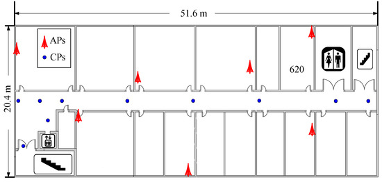 In this paper, we collected all the experimental data from a real office environment. The experimental environment was a rectangular region with dimensions of 51.6 m × 20.4 m, as shown in Figure 3. A total of 7 TP-LINK TL-WR845N (TP-LINK Co., Ltd., Shenzhen, China) APs were mounted in the experimental environment at a height of 2.2 m to offer wireless communication service, as shown in Figure 4a. Because the office rooms might not be free to enter for the crowdsourcing participants to collect RSS data, we selected 10 specific locations as CPs only in the corridor, which were marked with the blue points in Figure 3. We labeled the 10 CPs with 2-D code stickers on the ground of the corridor, as shown in Figure 4b, so that the crowdsourcing participants could scan the 2-D codes on the stickers and obtain the location coordinates of the CPs. Because we assumed that the crowdsourcing participants collected the RSS data and location coordinates of the CPs in a voluntary manner, the time for the crowdsourcing participants to collect these data must be less than one minute [45], and only 60 RSS samples were collected at each CP. We selected 92 RPs in the corridor and Room 620, and then collected 120 RSS samples at each RP. To test the proposed fingerprinting localization system, a trajectory consisting of 90 testing points (TPs) with 0.6 m gaps were selected from the end of the corridor near the elevator to Room 620 in order to simulate a person walking along the trajectory in the experimental environment. A total of 5400 RSS samples were collected along the trajectory to test the system. All the RSS data were measured by a Meizu M2 (Meizu Technology Co., Ltd., Zhuhai, China) smartphone that was placed on a tripod at a height of 1.2 m, as shown in Figure 4c. This smartphone was installed with our self-developed Android application software, the sampling rate of which was 1 RSS sample per second.